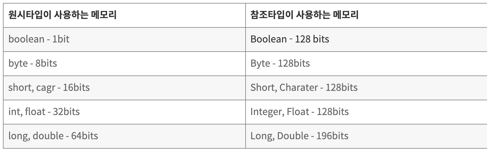 - 자바에서 숫자를 다루기 위한 타입들은 크게 두 가지로 분류할 수 있습니다. 하나는 '원시 타입(primitive type)'이고, 또 다른 하나는 참조 타입(reference type)'입니다. 원시 타입은 (int, double, boolean... )을 말하며, 참조 타입은 (Integer, Double, Boolean...)을 말합니다.