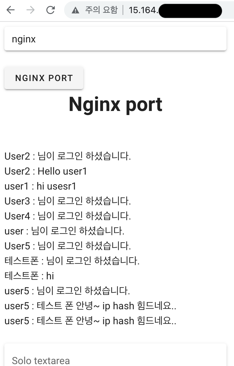 -.. ip_hash방식으로 하여 해당 ip는 반복적으로 같은 서버에 입장하게 된다. 때문에 다른 port로 접속하는 Ip를 찾는라 여러 기기를 이용하여 접속시도하였다.. 근데 pc 화면 캡처를 깜빡했네..