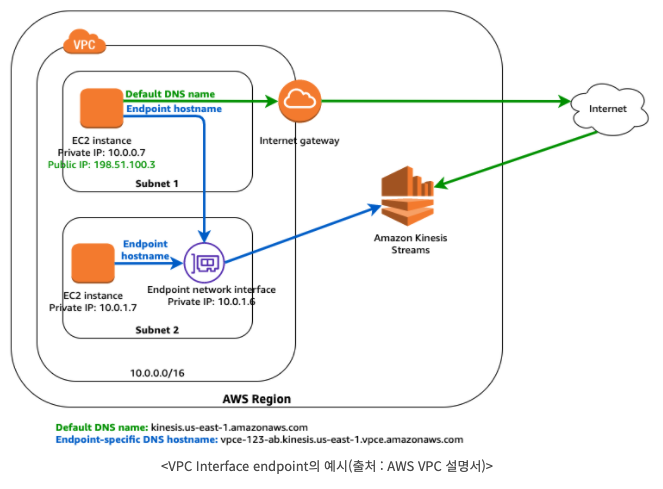 - nat gateway나 internet gateway를 사용하여 internet 접속 후 vpc 외부서비스를 이용하게 되는 경우 결국 인터넷에 노출되어 보안상에 위험이 생길 수 있다. 하지만 vpc end point를 이용하여 internet 연결없이 vpc 외부서비스를 이용할 수 있어 internet에 노출되는 것을 방지 할 수 있다. 궁금한점은 아마 동일한 aws region에서만 사용가능할 것 같다