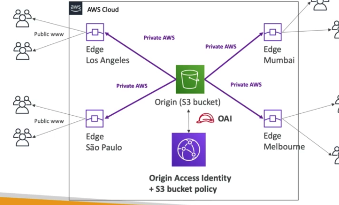 - s3 앞에 보통 흔한 패턴, 보안이 강화됨 OAI(s3 접근할때)사용, 어디서나 s3로 파일업로드 가능