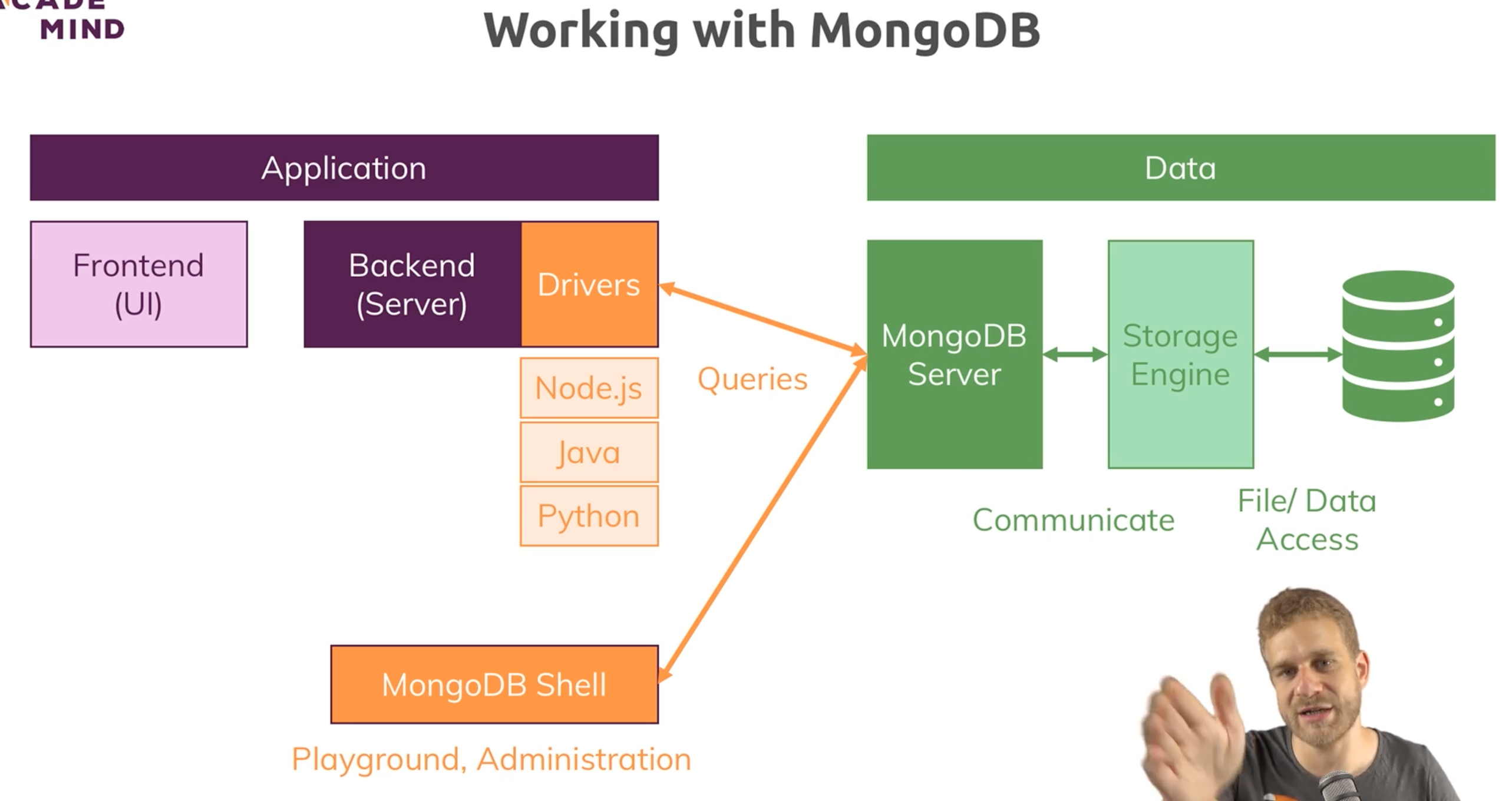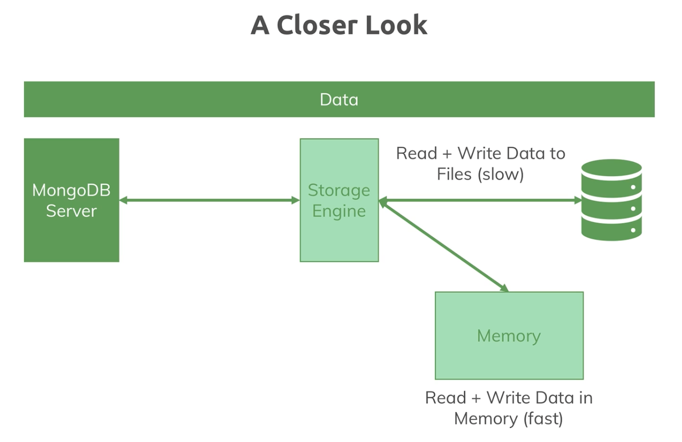 1. shell이나 driver(나같은경우는 node.js driver)를 이용하여 mongodb server에 query를 보내면 mongodb server가 direct로 data를 write하지 않는다. mongodb server는 storage engine과 communication을 하며 storage engine은 내가 마음에 듣는것으로 바꿀 수 있다. default로는 Wired Tiger engine을 사용한다. storage engine은 결국 file에 data를 저장하게 된다.