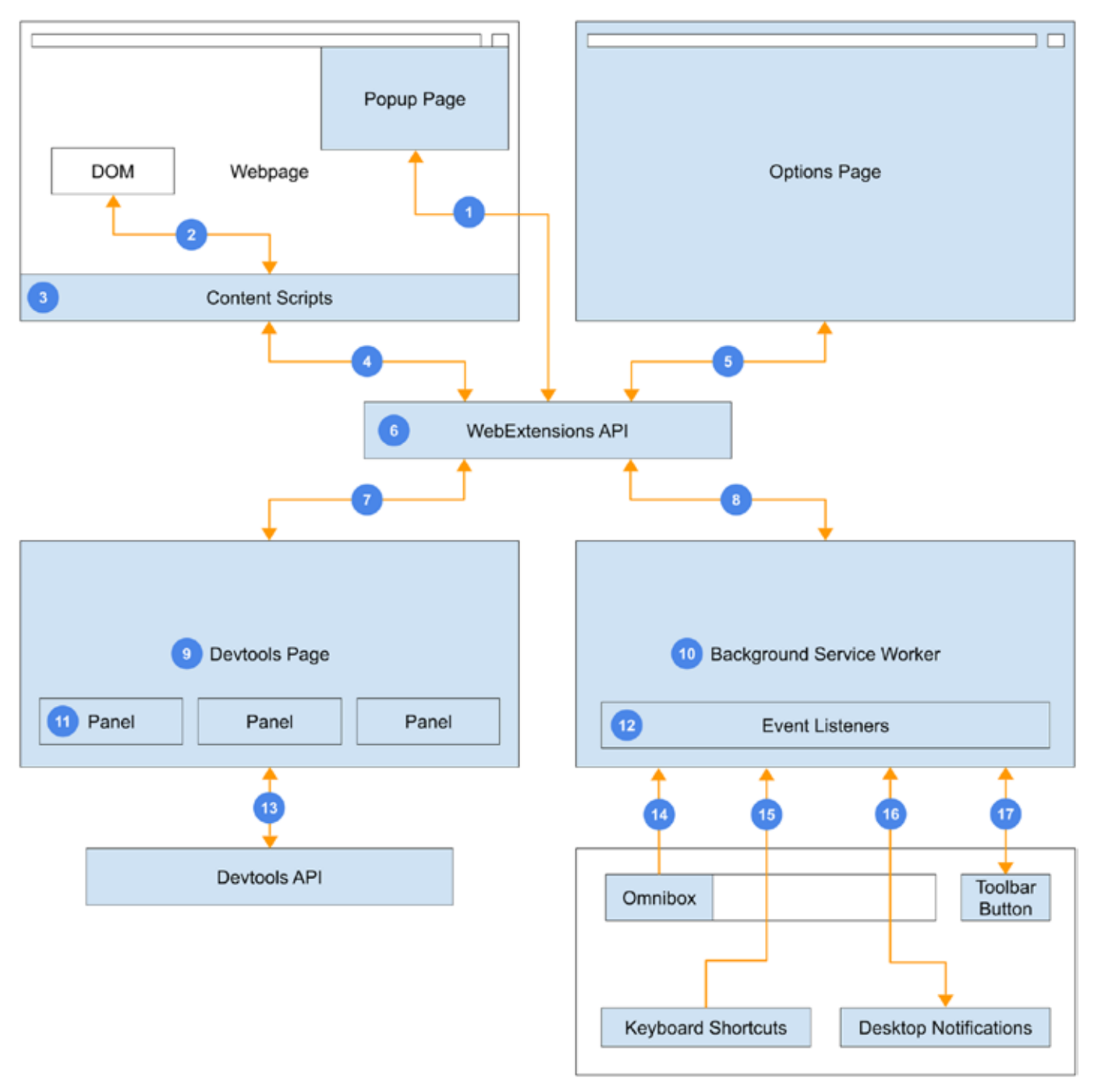 - 확장 프로그램의 다른 부분으로부터의 이벤트에만 응답할 수 있으며, 제한된 시간 동안만 실행된 후 종료됩니다(bootstrap -> idle -> die).
