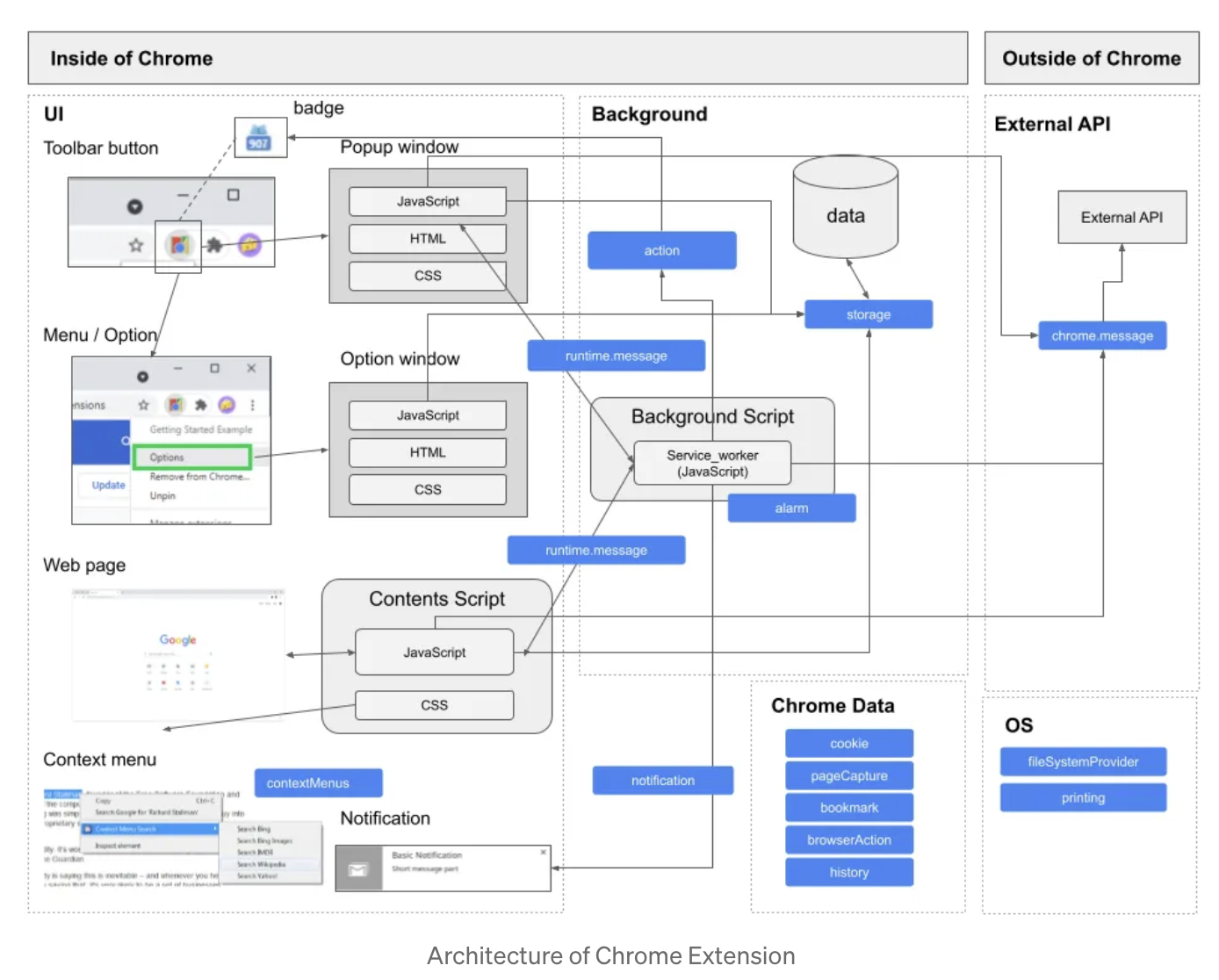 - 콘텐츠 스크립트는 높은 권한이 필요한 작업을 수행하기 위해 확장 프로그램의 다른 부분(보통 백그라운드 서비스 워커)으로 메시지를 보내야 합니다.
