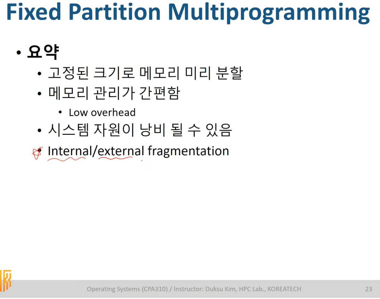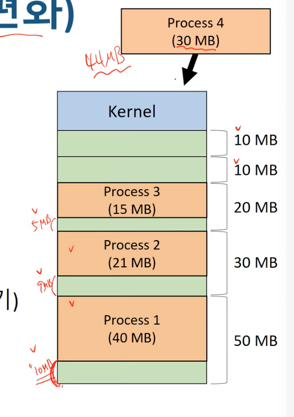 Fragmentation(단편화) 1. internal fragmentation - 내부 단편화 - partition 크기 > process 크기 -> 메모리가 낭비되는 현상 fragmentation 경우 메모리는 남았지만 방이 없을때