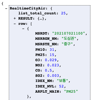 r = requests.get('http://openapi.seoul.go.kr:8088/6d4d776b466c656533356a4b4b5872/json/RealtimeCityAir/1/99')