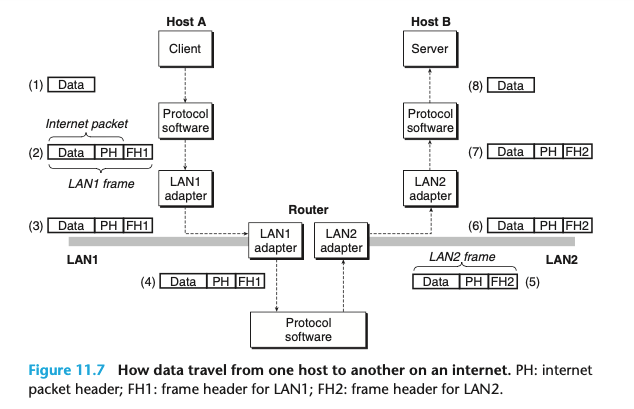 - 각 인터넷 호스트는 TCP/IP 프로토콜을 구현한 소프트웨어를 실행하며, 이것은 거의 모든 현대 컴퓨터 시스템에서 지원되고 있다.