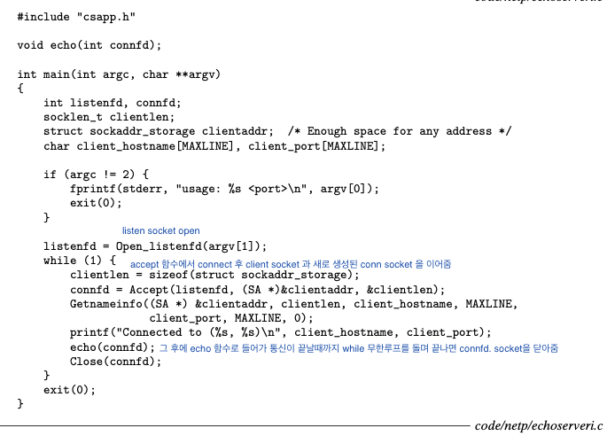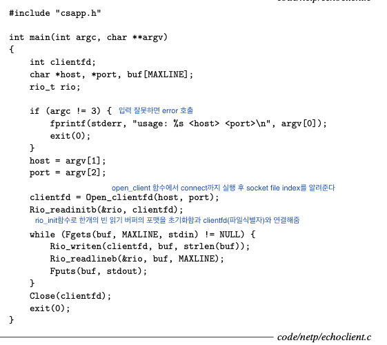 - 클라이언트와 서버는 소켓인터페이스와 Unix I/O 함수들의 혼합을 사용해서 통신한다.