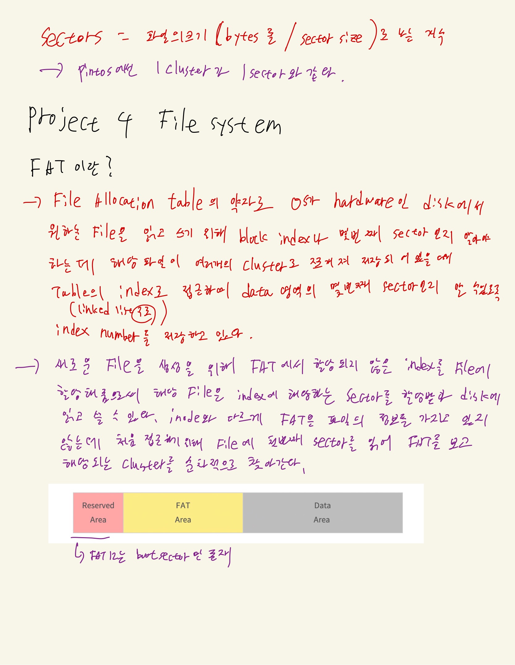 이러한 패턴이 매 프로젝트마다 이루어 졌으며 project4에서는 1주일에 기간이 주어지는데 그중 3일은 나만의 무기 프로젝트에 할당되며 사실상 4일이 주어진다. 안타깝게도 완주를 다 못할거라 깨닫고 목표가 filesystem의 이해와 project123을 새로 구현한 filesystem에서 작동되게만 해보자는 목표로 진행하였고 file growth랑 subdirectory, soft link까지만 구현을 하기 위해 노력하였다.